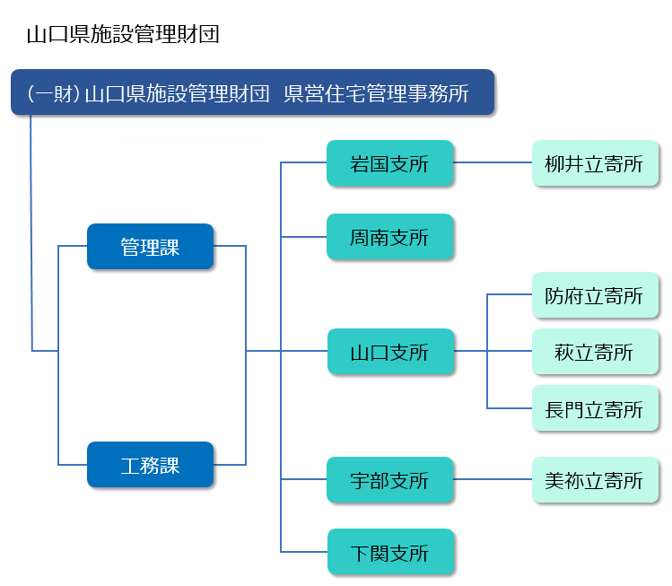組織 ((一財)山口県施設管理財団 維新百年記念公園事務所) 事業概要 平成24年度から、当財団県営住宅管理事務所が指定管理者として、県営住宅の管理業務(入居者募集業務、家賃収納業務、修繕業務など)を行っています。